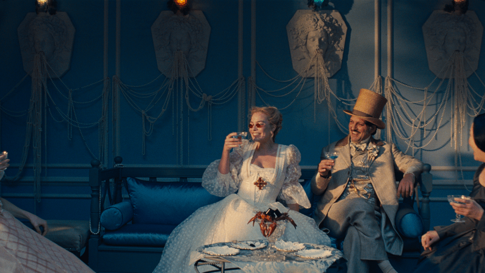 Davies dice: “Emerald dijo: ‘Quiero un montón de botellas para mostrar, obviamente, que Earnshaw es un desastre y una ruina, y que está bebiendo hasta morir’. » » Con esta directiva, Davies construyó una torre de botellas de vino de cinco pies de altura. “Ella dijo: ‘No, diez pies de altura’. Sólo quiero ver una ola de botellas'”. Davies y su equipo construyeron la película para que el director de fotografía Linus Sandgren pudiera iluminarla. “El poder de esa escena en la que Martin Clunes está en el suelo con estas dos enormes montañas verdes de montañas de alcohol. Todo en Emerald es ‘sigue adelante y maximalista'”.