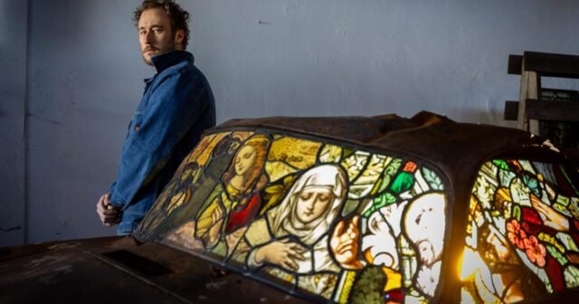 Las vidrieras recuperadas de iglesias son el centro de la práctica del artista Ben Tuna. “Todas estas ventanas eran hermosas en ese momento, pero han sido olvidadas”, dijo.