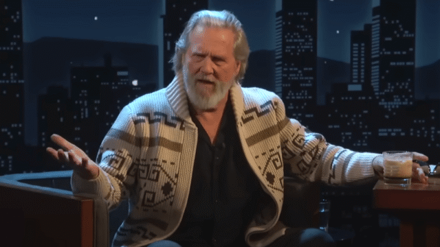 Kimmel sacó un cárdigan y un par de gafas de sol para ayudar a Bridges a canalizar a The Dude, quien sigue siendo uno de sus personajes más emblemáticos. El actor aceptó felizmente y le dieron una bebida White Russian para ayudarlo a completar su transformación en The Dude.
