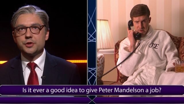 El boceto presentaba a Al Nash como Jeremy Clarkson, también conocido como “falso granjero y verdadero imbécil”, como presentador de “¿Quién quiere ser millonario?” y George Fouracres como Starmer. La pregunta que se hizo fue: “¿Sigue siendo una buena idea darle un trabajo a Peter Mandelson?” Sus posibles respuestas fueron: A: No; B: Por supuesto que no; C: Ni en un millón de años; D: Sí.