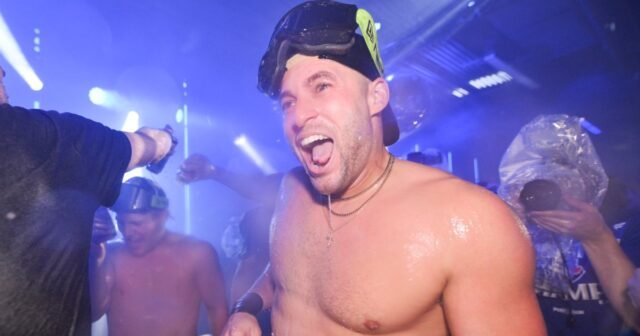 TORONTO, ON – 20 DE OCTUBRE: George Springer de los Toronto Blue Jays celebra en la casa club después del Juego 7 de la Serie de Campeonato de la Liga Americana presentada por Booking.com entre los Seattle Mariners y los Toronto Blue Jays en el Rogers Centre el lunes 20 de octubre de 2025 en Toronto, Ontario, Canadá.