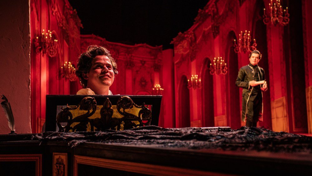 La primera vista que recibe un Playhouse cuando se apagan las luces es suficiente para provocar un leve jadeo en el público. Detrás de un lienzo pintado con las notas de “Phantasie für eine Orgelwalze” de Mozart se puede vislumbrar por primera vez la sala mágicamente alargada que seguirá siendo el único escenario del espectáculo, un espectáculo lo suficientemente intrigante y cosquilleante como para hacerte sentir muy bien al no tener grandes cambios de escenario durante las próximas tres horas. Es una representación en perspectiva forzada de una habitación que parece extenderse hasta la mitad del camino hacia Old Town Pasadena. (Más tarde, se crea un buen chiste cuando el actor que es, con mucho, el más grande del programa, Matthew Patrick Davis como el Emperador José II, entra por una de las pequeñas puertas en la parte trasera). Parte del conjunto se encuentra preternaturalmente encaramado sobre esta sala carmesí, elevado, como una nube bíblica de testigos reunidos para presenciar el comienzo de esta fábula ligeramente demoníaca.