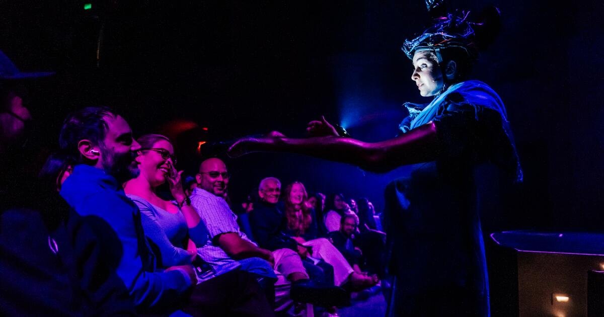 Pero fue reconfortante experimentar una actuación tan seductora y extraña en el Pasadena Playhouse. El entretenimiento convencional nos alimenta con mentiras: todos somos bichos raros que luchamos por encontrar nuestro camino. “Ja, ja, ja, ja, ja, ja” nos recuerda que somos simplemente un intruso ingenuo y solidario que nos impide hacer del mundo un poco más acogedor.