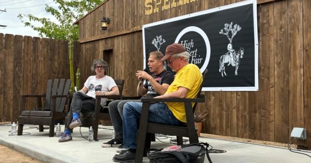 El legendario artista callejero y activista Shepard Fairey estuvo en todas partes en la Feria de Arte High Desert, que tuvo lugar en Pioneertown y sus alrededores durante dos días inusualmente cálidos el fin de semana pasado. Fundado hace más de siete años por el marchante de arte Nicholas Fahey y la directora creativa Candice Lawler, el evento ha pasado de unas pocas docenas de personas en la sala de Lawler a unos pocos miles deambulando por los polvorientos y soleados alrededores de la cursi ciudad del Viejo Oeste, con eventos paralelos en Twentynine Palms y Joshua Tree.