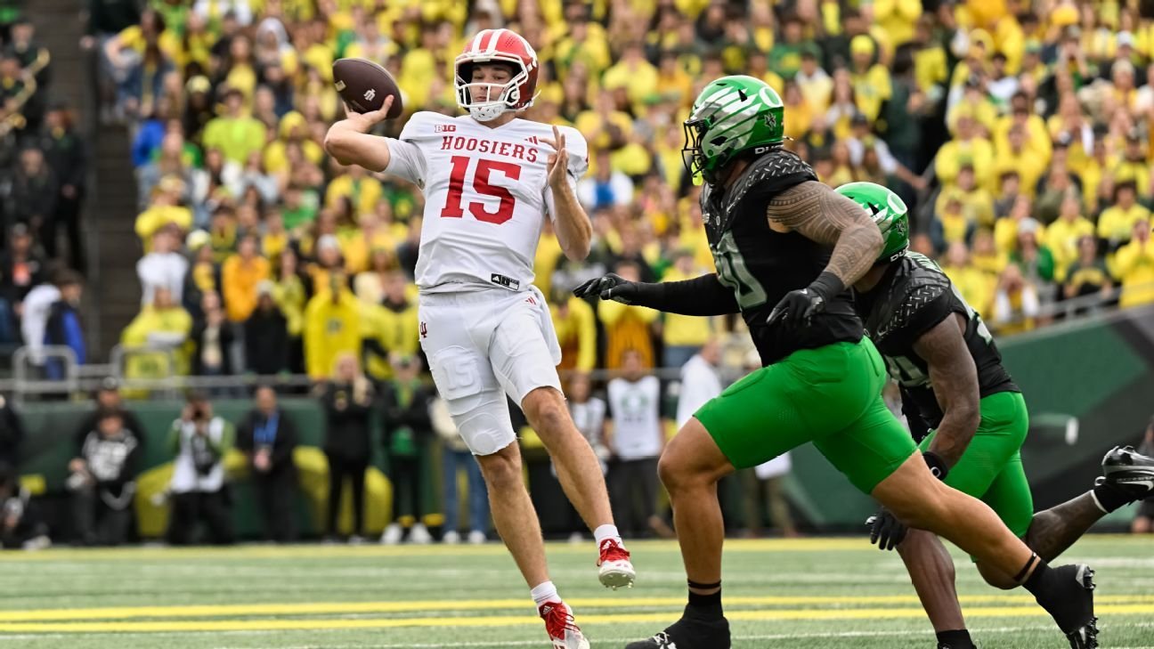El No. 7 Indiana viajó para enfrentar al No. 3 Oregon. Los Ducks tuvieron marca de 7-0 en casa de todos los tiempos en enfrentamientos Top 10 de AP. Eso fue hasta el sábado. Los Hoosiers consiguieron su primera victoria como visitantes contra un oponente entre los 10 mejores. Fernando Mendoza totalizó 246 yardas y lanzó un pase de touchdown. La defensa de los Hoosiers forzó dos grandes intercepciones del mariscal de campo de Oregon, Dante Moore.