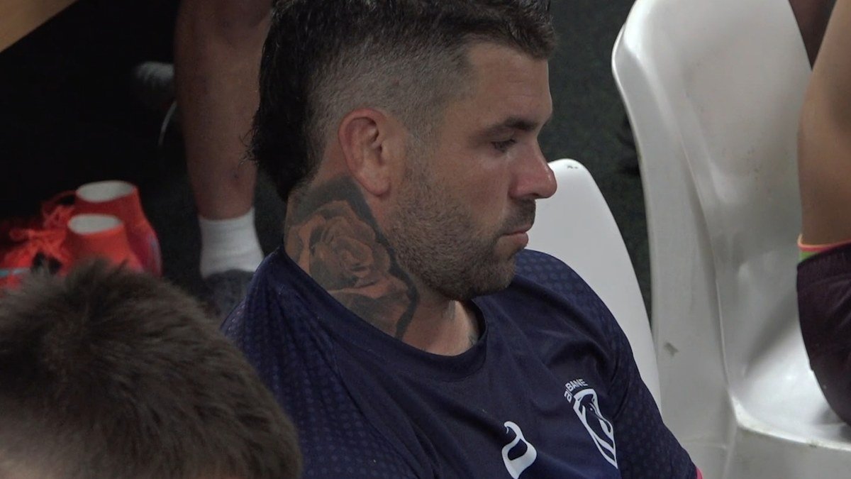 El jugador de 35 años estaba pasando cuando el zaguero del Eels, Kitione Kautoga, lo puso de espaldas.