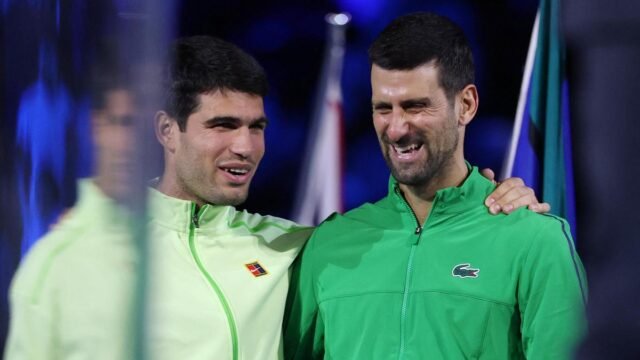 Carlos Alcaraz celebra junto a Novak Djokovic tras ganar la final individual masculina del Abierto de Australia el 1 de febrero de 2026. | Crédito de la foto: Reuters