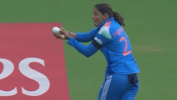 La capitana Harmanpreet Kaur estaba en el centro del juego y tenía su cuerpo de lado del balón, que descansaba perfectamente a la altura del pecho.
