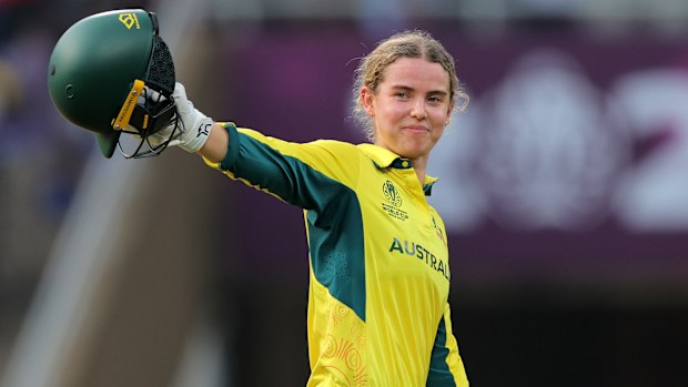 Litchfield hizo historia en el torneo contra India, celebrando su hazaña con una sonrisa radiante después de alcanzar los cien más rápidos en un partido eliminatorio de la Copa del Mundo.