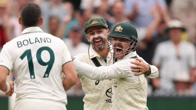 Nathan Lyon y Travis Head celebran un terreno de Scott Boland durante la serie de pruebas del verano pasado contra India. Getty