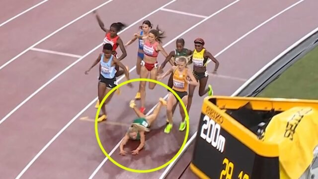 Jessica Hull tomando una caída en su calor de 800 metros. Nueve