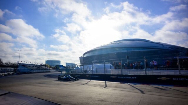 La práctica para el Gran Premio inaugural de Arlington se reanudó después de un retraso de varios minutos mientras los funcionarios de IndyCar revisaban el circuito temporal de 2,73 millas y 14 curvas en las calles alrededor de los estadios de los Dallas Cowboys y Texas Rangers.