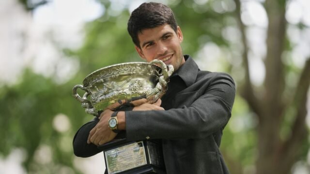 Alcaraz posó para los fotógrafos el lunes con el ornamentado trofeo del Abierto de Australia, luciendo casualmente elegante vestido de negro, mocasines y sin calcetines. La sesión de fotos tuvo lugar en el Royal Exhibition Building, en medio de los jardines del centro de Melbourne.