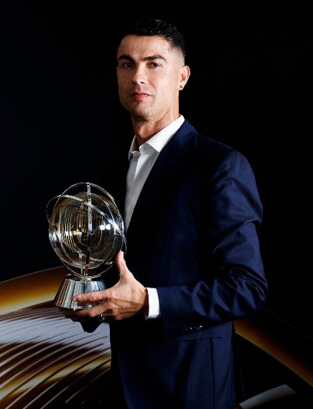 Cristiano Ronaldo, fotografiado con su Globo Prestigio en la ceremonia del martes por la noche, es el primer futbolista multimillonario en el mundo, pero simplemente prefiere jugar para Portugal.