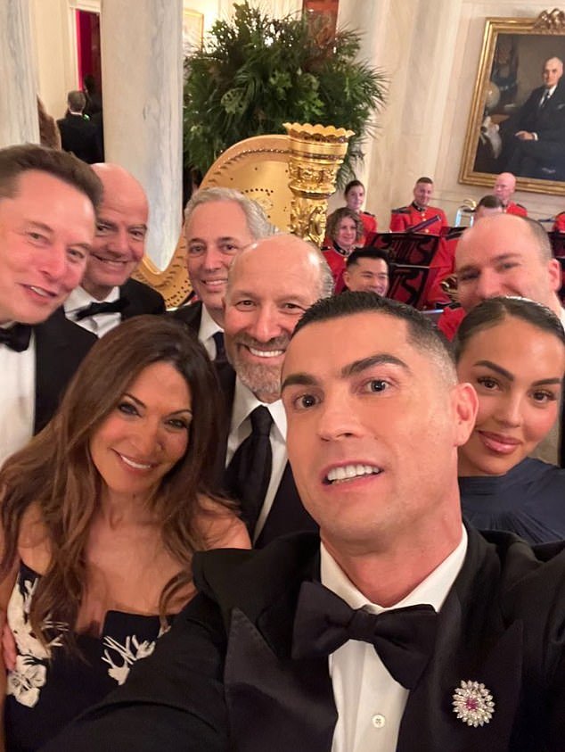 Ronaldo, que juega en la Saudi Pro League, forma parte de la delegación y su prometida, Georgina Rodríguez, se unió a él en la capital del país. Se vio al hombre de 40 años vistiendo un esmoquin negro mientras tomaba asiento junto a Elon Musk y el vicepresidente JD Vance. Luego se tomó una selfie junto a Elon Musk, el presidente de la FIFA, Gianni Infantino, y algunas de las personas más poderosas del mundo.
