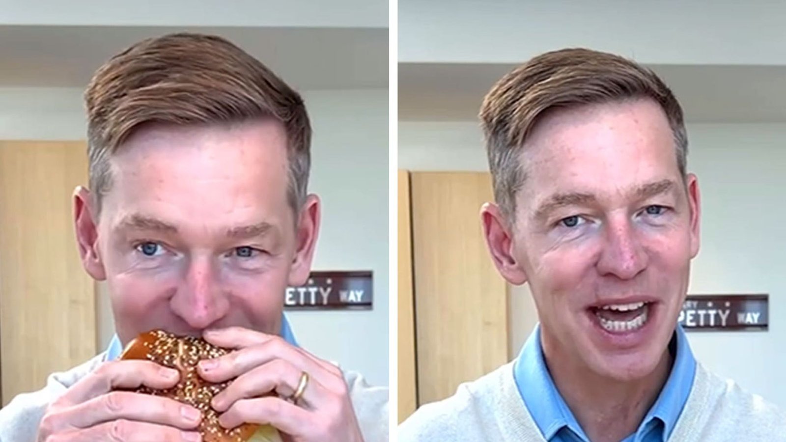 En el clip ahora viral que circula en línea, Chris Kempczinski comienza cantando alabanzas a la hamburguesa, luego parece de alguna manera tomado por sorpresa por las cebollas crujientes… antes de finalmente prepararse para el gran bocado y apenas hacer mella.