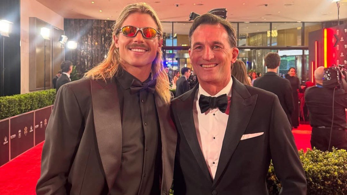 Bailey Smith de Geelong y el director ejecutivo de la AFL, Andrew Dillon, en la foto de la Medalla Brownlow 2025. @bazlenka a través de Instagram