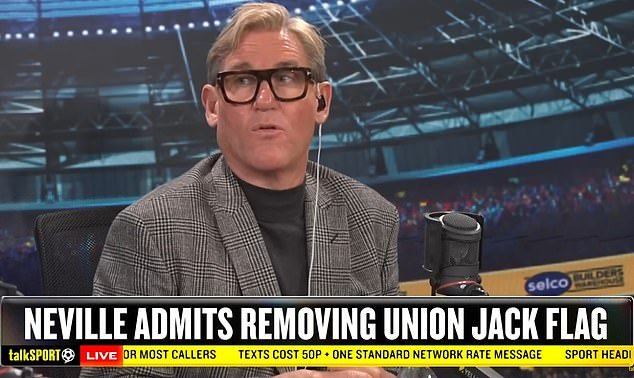 Gary Neville (arriba) provocó una furiosa reacción en línea después de que sus comentarios sobre el ataque a la sinagoga de Manchester se pusieron en una queja de “ hombres blancos de mediana edad ” dividiendo a Gran Bretaña al levantar banderas de la Unión