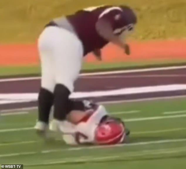 Después de que el juego se alejó del partido individual entre los dos, con el piso de 15 años en el suelo, el jugador ofensivo de Kalamazoo Central deja sus pies y aterriza con su peso corporal completo en su rival.