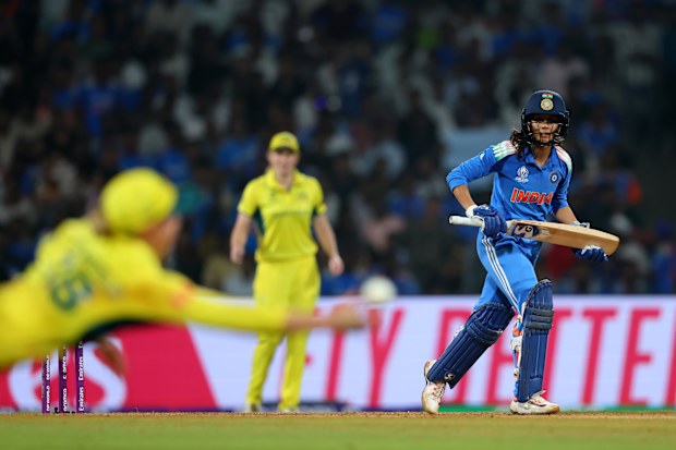 Jemimah Rodrigues de la India observa mientras Phoebe Litchfield de Australia la deja caer (oscurecida) durante la semifinal de la Copa Mundial de Críquet Femenina ICC India 2025 entre India y Australia en el estadio DY Patil el 30 de octubre de 2025 en Navi Mumbai, India. (Foto de Alex Davidson-ICC/ICC vía Getty Images) IPC a través de Getty Images