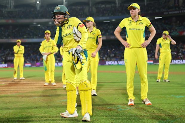 Alyssa Healy de Australia se quita el casco mientras sus compañeras de equipo parecen abatidas después de su derrota durante la semifinal de la Copa Mundial de Críquet Femenina ICC India 2025 entre India y Australia en el estadio DY Patil el 30 de octubre de 2025 en Navi Mumbai, India. (Foto de Alex Davidson-ICC/ICC vía Getty Images) IPC a través de Getty Images