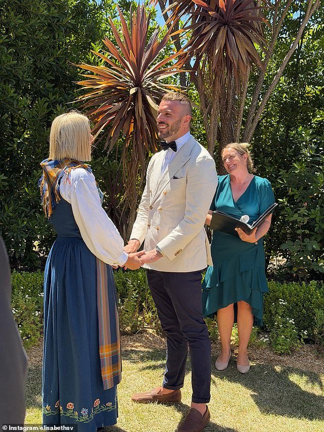 Løyning vistió un traje tradicional noruego mientras intercambiaron votos en un hermoso jardín, y Chalmers vistió pantalones negros, una chaqueta de traje beige y una pajarita para la gran ocasión.