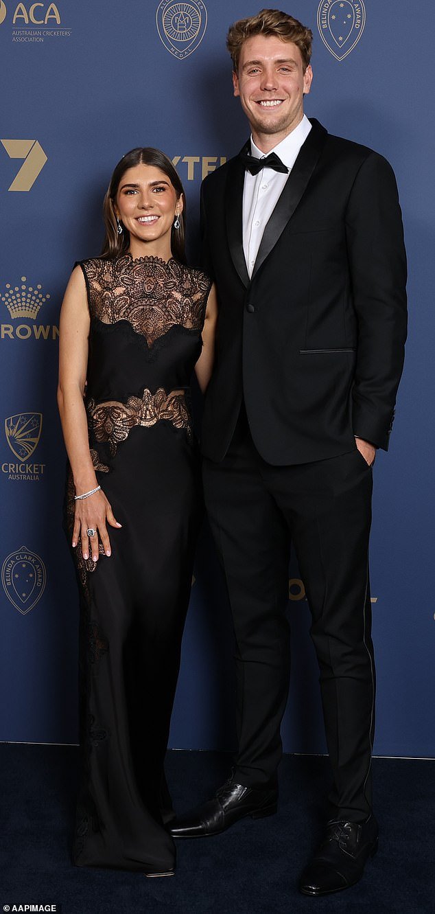 La estrella del críquet Cameron Green claramente siente la presión por su falta de carreras en el pliegue (en la foto, con su prometida Emily Redwood)