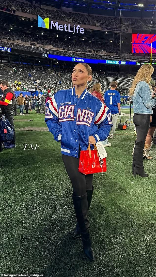 Chloe Rodríguez lució una deslumbrante chaqueta personalizada de los Giants para el jueves por la noche de fútbol