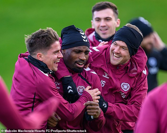 Cammy Devlin, Elton Kabangu y Blair Spittal comparten una broma en el entrenamiento de Hearts
