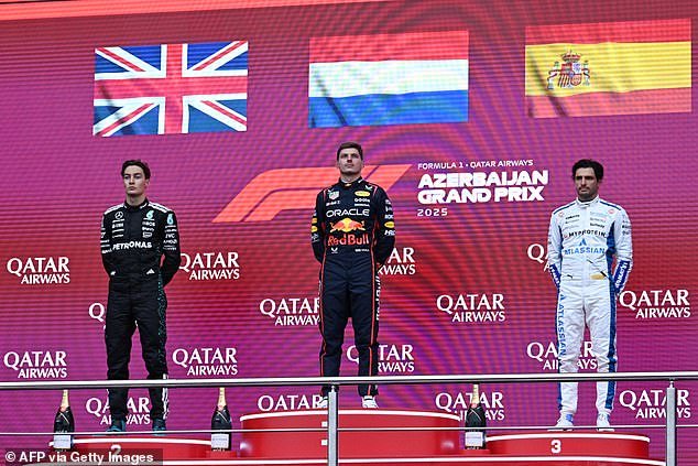 Max Verstappen se alza con orgullo mientras está flanqueado por George Russell y Carlos Sainz