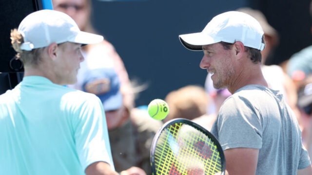 Lleyton Hewitt habla con Cruz Hewitt durante una sesión de práctica en el Abierto de Australia. Getty