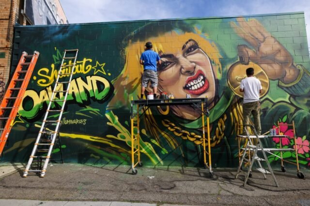Los artistas de luminarias Steve Ha, Tim Hon y Eric Nodora trabajaron en el mural en el barrio de Temescal durante varios días mientras los residentes observaban el progreso. El mural de Liu reemplaza a uno de la ex estrella de los Golden State Warriors, Klay Thompson.