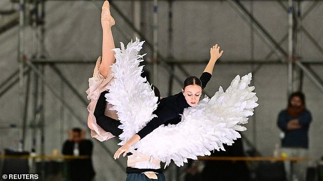 Bailarines voluntarios ensayan durante los preparativos de la ceremonia inaugural en una estructura temporal junto al estadio de San Siro