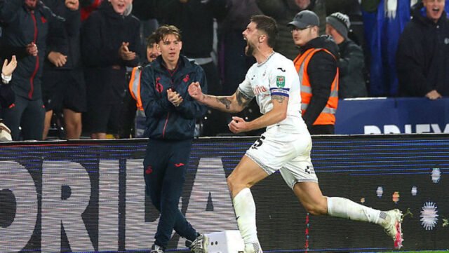 Swansea City Cameron Burgess celebra anotar el tercer gol de su equipo. Getty