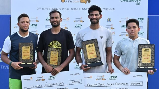 Pruchya Isaro, derecha, y Nikki Poonacha, segunda derecha, los ganadores de dobles masculinos con Jay Clarke, izquierda, y Mukund Sasikumar, finalistas del torneo Chennai Open ATP Challenger en Chennai el sábado 14 de febrero de 2026. | Crédito de la foto: B. VELANKANNI RAJ