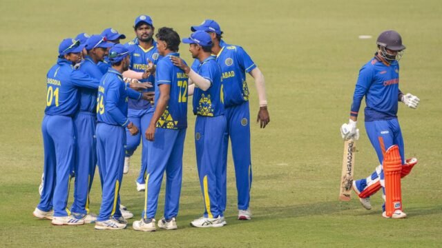 Aunque los abridores Tanmay Agarwal y Rishiket Sisodia cayeron en el segundo over bien ejecutado del cerrador Sandhu, Aman Rao (33, 26b, 2×4, 2×6) y Pragnay Reddy (43, 31b, 4×4, 2×6) no dudaron en correr riesgos. A pesar de tres indultos, Hyderabad totalizó 61 de dos en el PowerPlay.