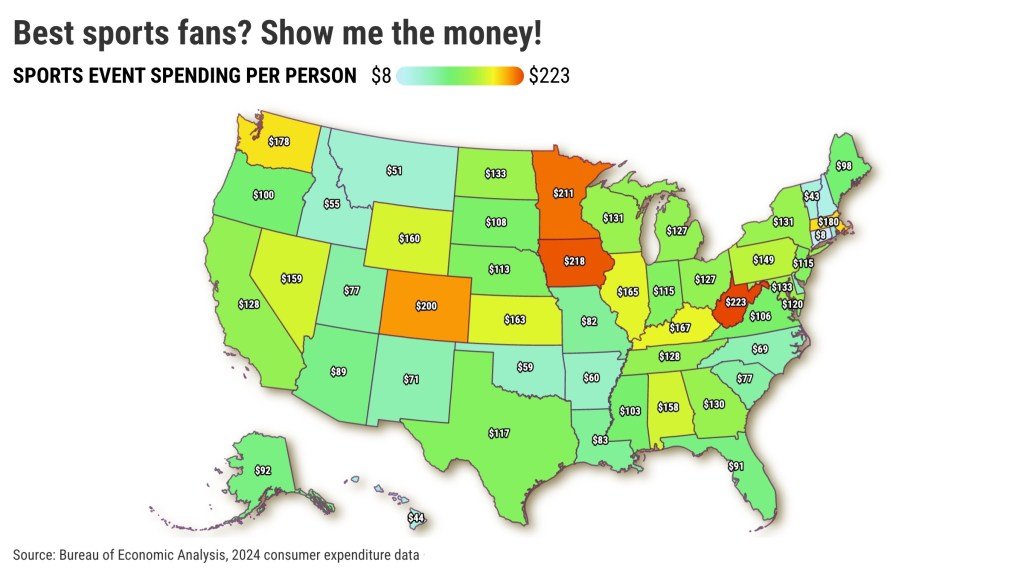 Usando esta métrica, los mejores fanáticos de los eventos deportivos en vivo están lejos de la costa: el número 1 fue Virginia Occidental con $223 por persona, luego Iowa con $218 y Minnesota con $211. Uno de los hilos conductores de estos mercados deportivos es el atletismo universitario de alto nivel.