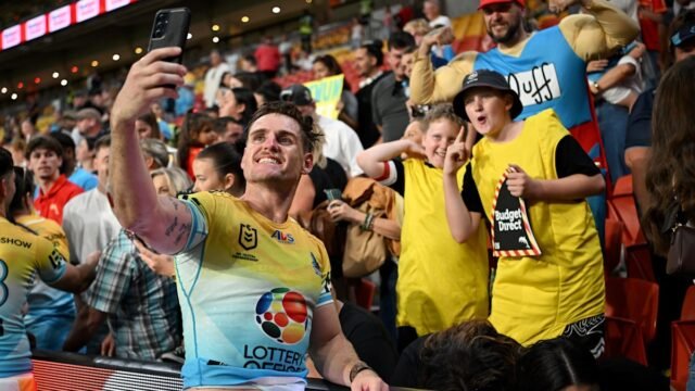 AJ Brimson con fanáticos de los Titans. Imágenes de NRL