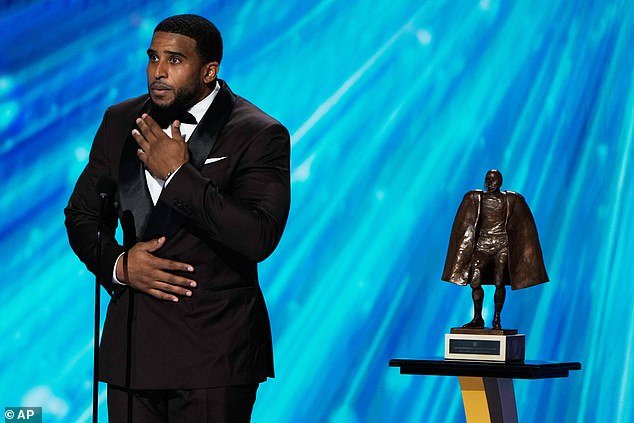 El jugador de 35 años ha sido una amenaza constante a lo largo de su carrera, obteniendo 10 nominaciones al Pro Bowl, pero fue su trabajo fuera del campo lo que fue reconocido el jueves por la noche.