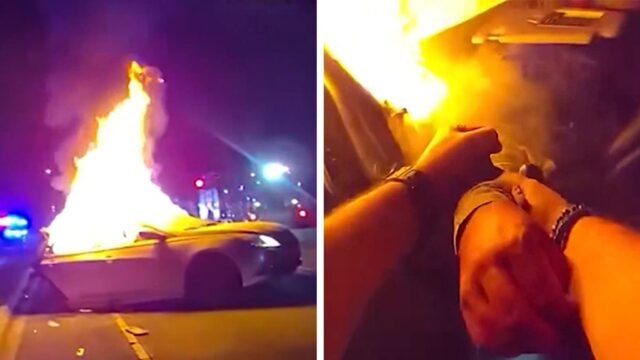 Un oficial de policía saca a una mujer de un vehículo en llamas después de un accidente de robo, muestra un video