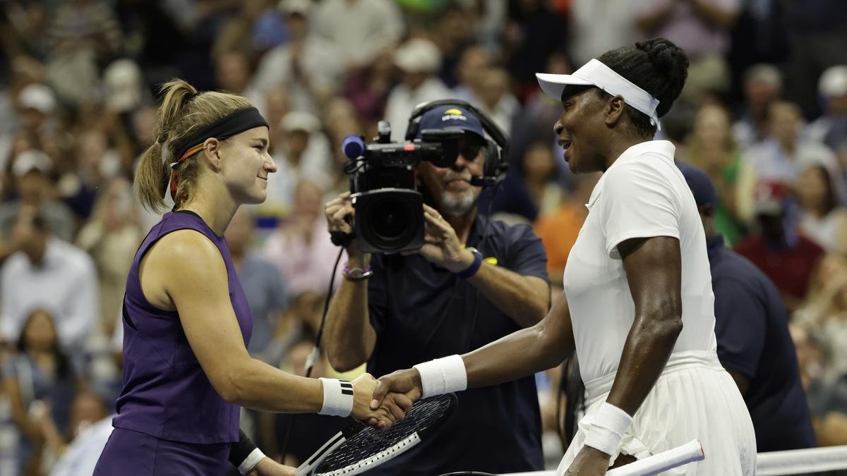 Karolina Muchova, de la República Checa, se da la mano con Venus Williams durante la primera ronda del Campeonato Americano de Tenis Abierto el 25 de agosto de 2025 en Nueva York. | Crédito de la foto: AP