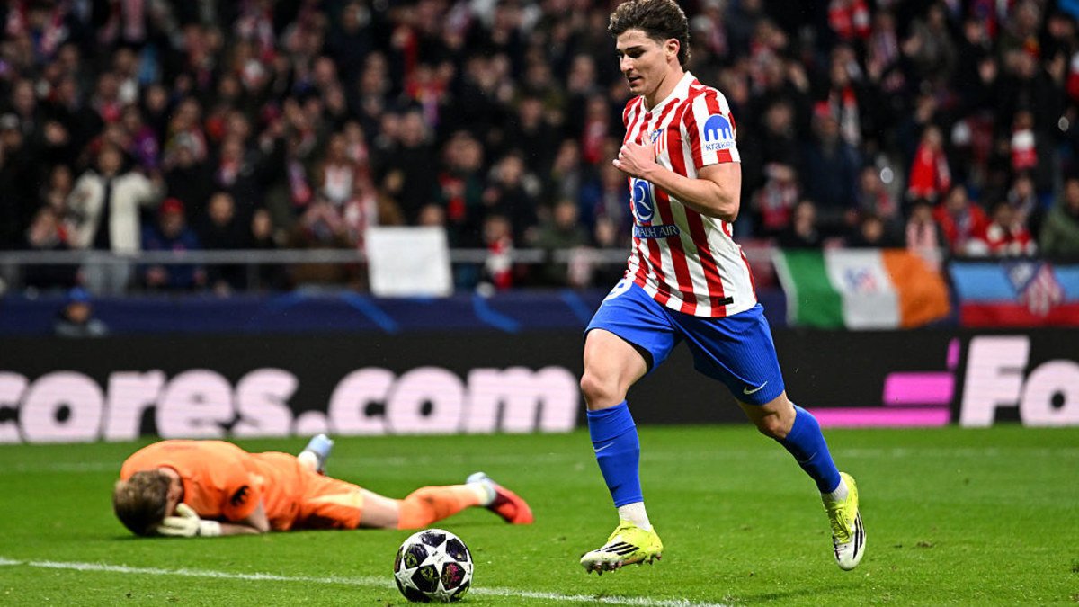 Julián Álvarez, del Atlético de Madrid, anota el tercer gol de su equipo cuando Antonin Kinsky cae. Getty