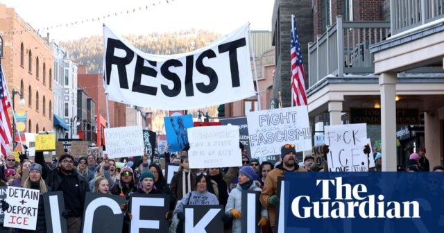 Las protestas en persona han sido menos concurridas este año, aunque a lo largo de Main Street hay carteles y lemas caseros contra ICE. El domingo por la noche, unas 100 personas, incluida la estrella de El Señor de los Anillos, Elijah Wood, se reunieron allí para una manifestación de 10 minutos llamada “Sundancers Melt ICE”. “La gente que ha sido asesinada ilegalmente en Minnesota es horrible”, dijo Wood. Fecha límite. “Aquí estamos en este festival de cine que trata de unir a la gente; se trata de contar historias de todo el mundo. Aquí no estamos divididos; nos estamos uniendo”. Con más tiempo para organizarse y difundir el mensaje, una multitud más grande caminar el lunes principal por la tarde, sosteniendo pancartas que decían “RESISTIR” y cantando “¡Abolir ICE!”