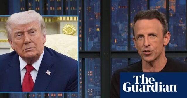 “Donald Trump quiere desesperadamente ser rey”, dijo Seth Meyers el miércoles por la noche. “Todos lo sabemos. Le encanta la pompa y la fanfarria y poner su cara y su nombre en todo. Su tienda oficial vende de todo, desde pelotas de golf Trump hasta koozies de cerveza Trump, paletas de pickleball Trump y collares para perros Trump, que puedes conseguir en tres tamaños: caniche, doberman y JD Vance.