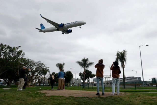 La gente observa cómo aterriza un avión de United Airlines en el Aeropuerto Internacional de Los Ángeles.