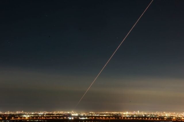 Las baterías antimisiles disparan misiles interceptores contra misiles balísticos lanzados desde Irán, como se ve sobre Tel Aviv, durante la guerra con Irán y los lanzamientos de misiles en curso hacia Israel, el 7 de marzo de 2026. (Crédito: CHAIM GOLDBERG/FLASH90)