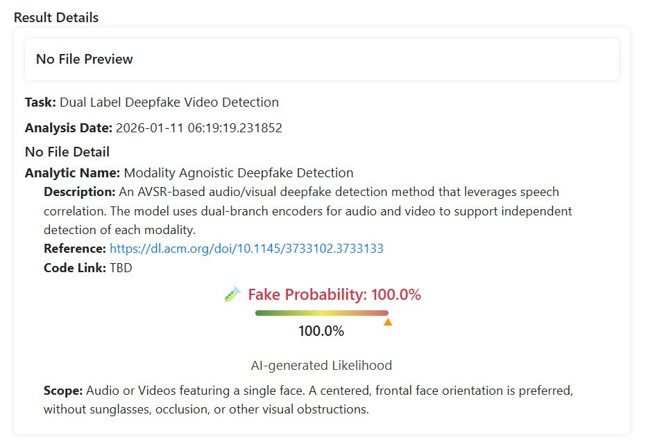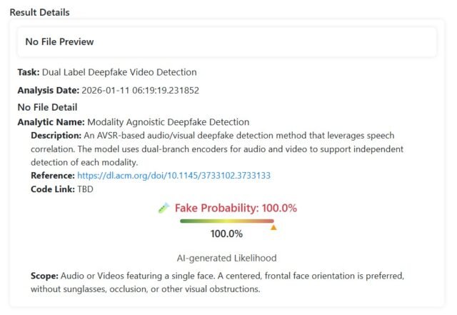 La AFP difundió el clip en el DeepFake-o-metro herramienta desarrollada por la Universidad de Buffalo que descubrió que era 100% probable que fuera generada por IA (enlace archivado).