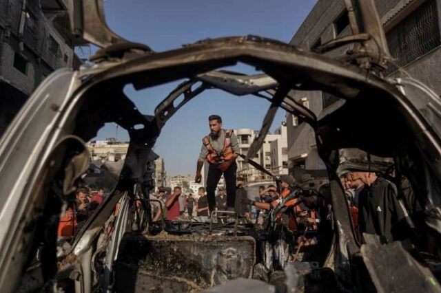 Palestinos y equipos de defensa civil recuperan a las víctimas muertas en un ataque aéreo israelí contra un vehículo en la zona de Abbas, al oeste de la ciudad de Gaza. Omar Ashtawy/Images APA vía ZUMA Press Wire/dpa