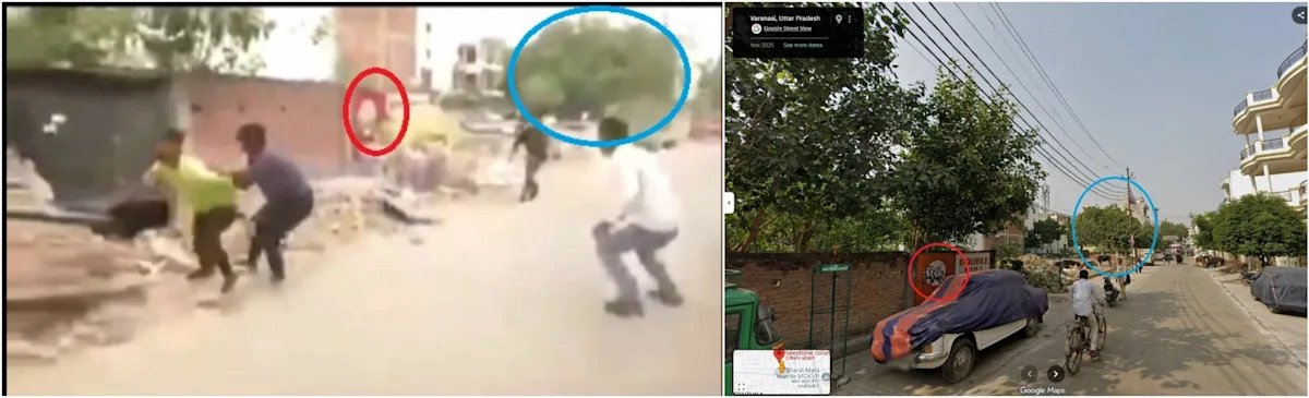 La AFP pudo confirmar que el vídeo fue filmado en Uttar Pradesh –y no en Bengala Occidental, como afirman erróneamente las publicaciones– por comparar con Vista de la calle en Google Maps de la misma calle en Varanasi (enlace archivado).
