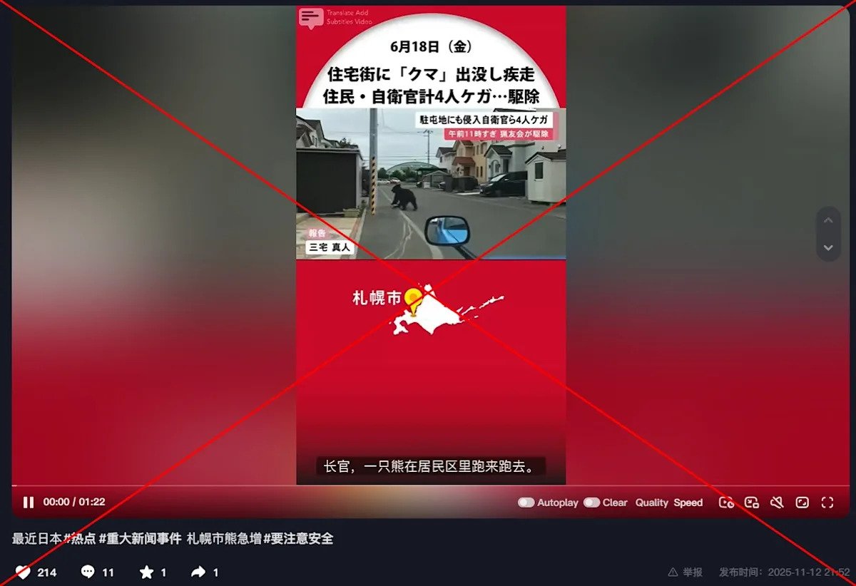 EL video se compartió en Douyin el 12 de noviembre de 2025, con una leyenda en chino simplificado diciendo que recientemente ha habido un aumento en el número de avistamientos de osos en Sapporo.